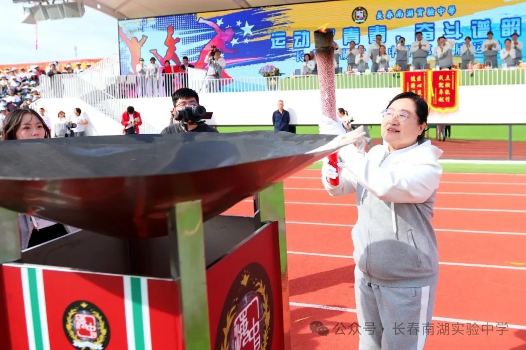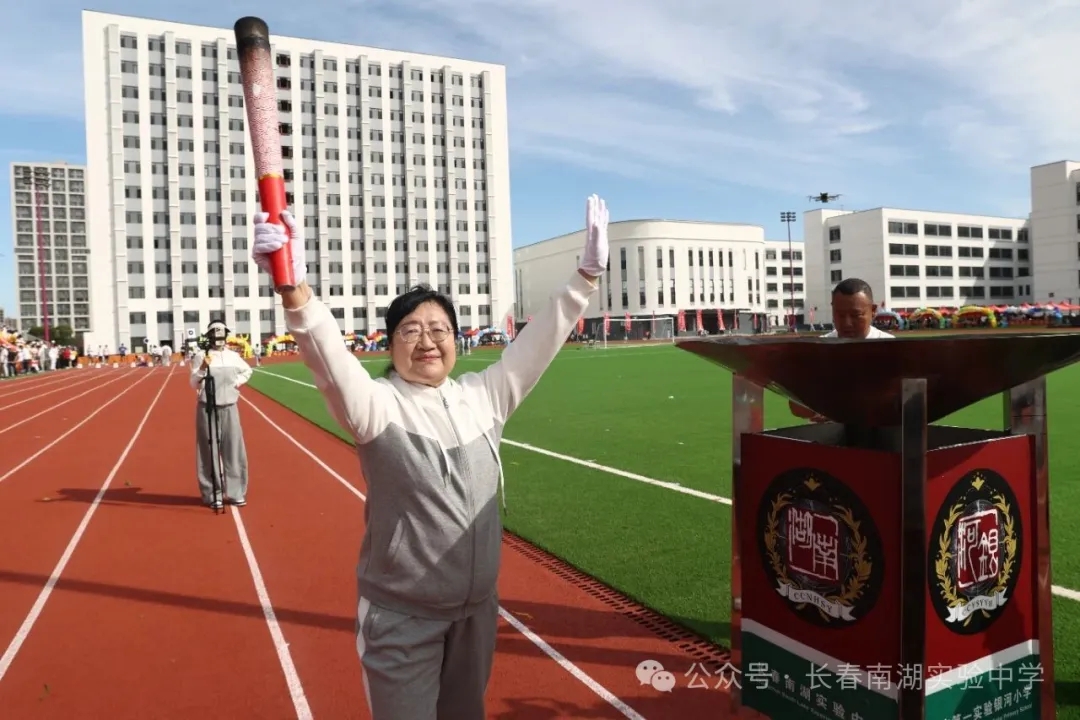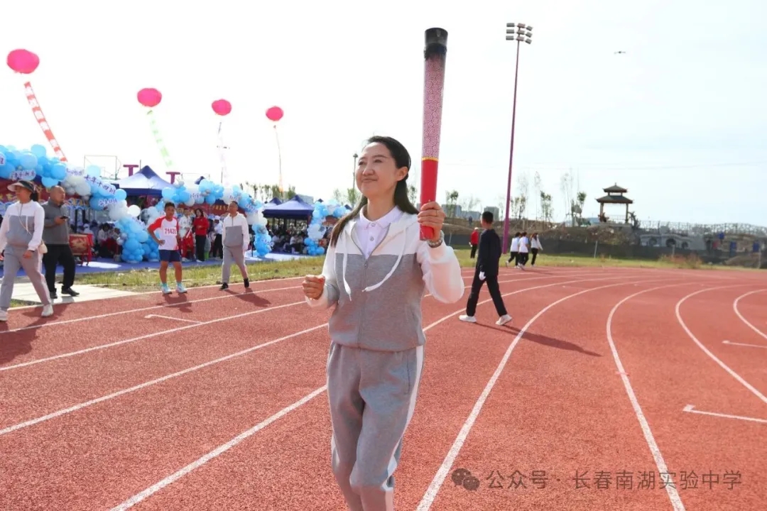 刘卓娟校长正手持火炬,稳步走向主火炬台——她手中的火焰,不仅是赛场拼搏的信号,更是新校址首次运动会的精神图腾!