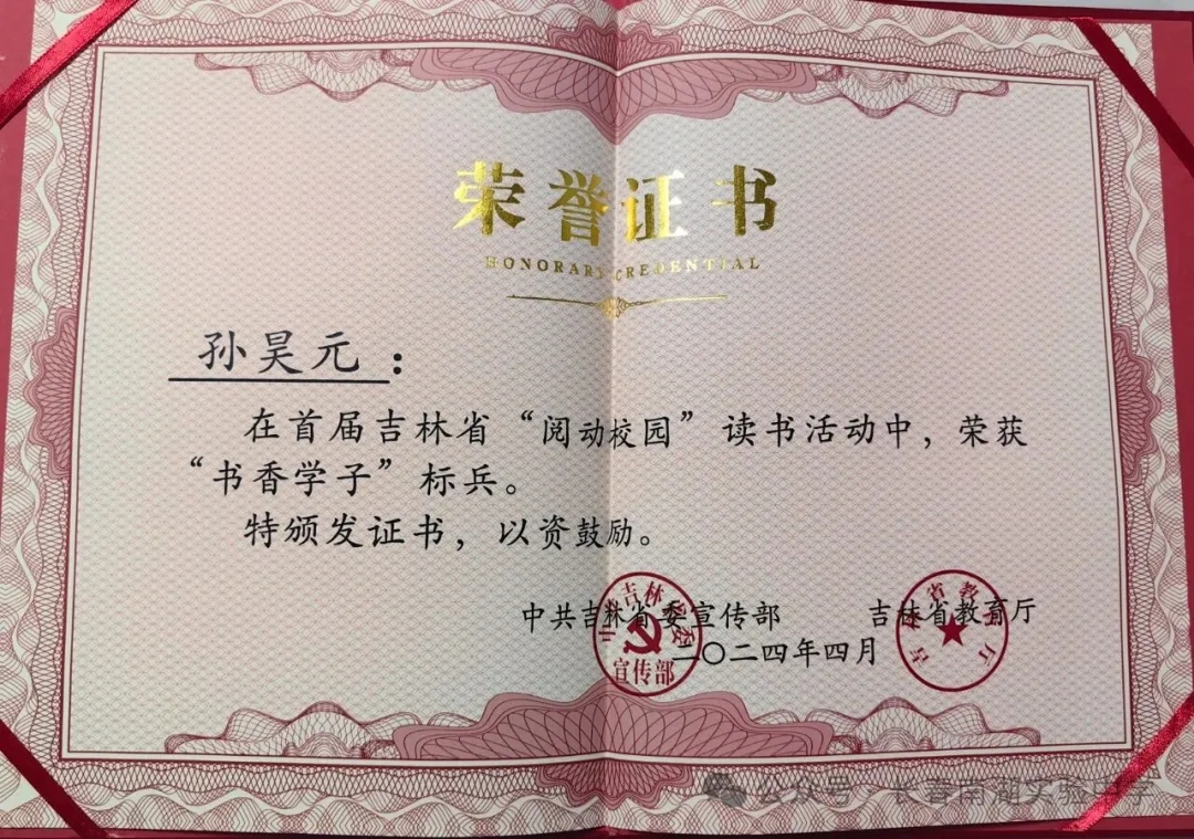 ● 2024年被中共吉林省委宣传部、吉林省教育厅授予首届吉林省“阅动校园”读书活动“书香学子”标兵荣誉