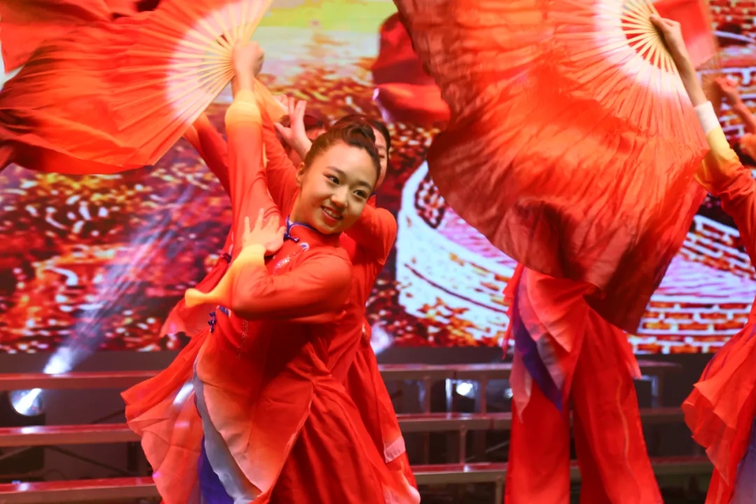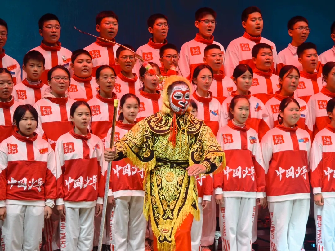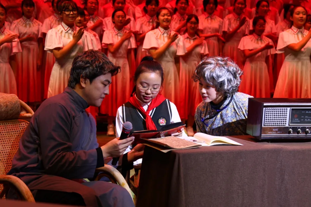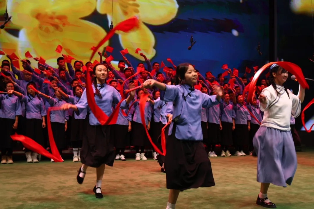 七年级舞蹈社团的学子们以昂扬的姿态、有力的舞步踏响时代节拍,一抹抹耀眼的中国红在舞台上流转,瞬间点燃全场的热情,为这场跨越时空的历史邀约,拉开恢弘序幕。